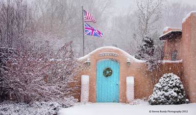 This is my next door neighbor’s front entry gate. This was the first big snow of the winter. I would venture a guess of approximately 3-4 inches of snow fell during the day. With the snow blowing directly into my face it made for interesting maneuvers to keep the flakes off of the front of the lens. If you look closely, the Union Jack is flying under the US Flag. Could make you second guess that we are actually in Taos. This is located east of the Taos Plaza along US Highway 64, then turn right on Dolan Street. I will be on your right side. The snow adds a lot to the image, so try it in the winter only.