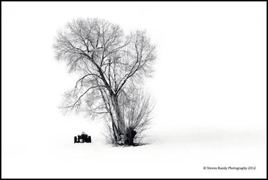 This tree & tractor are in the middle of open farm land. With the new fresh snow from the night before, everything around the tree was smooth pure white. I was also driving down an elevated on a road that runs down a large vertical slope, so the angle of the camera played a large part of this image working. When I took this image I visualized a black and white image. Nice when it works out that way. Valdez is a village north of Taos, Rake US Highway north out of Taos, turn right on State highway 150 and then turn left onto State Highway 230. Continue north on 230 until the road comes to a Tee intersection. Turn right and go “down” the road towards Valdez. The tree will be on your left about ¾ of the way down the grade. To get this shot, you will need some snow too!!