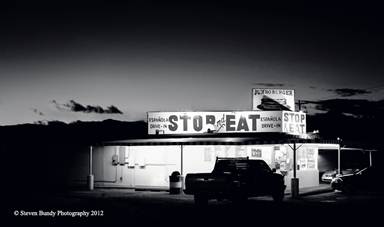 Everyone that lives in Taos and have driven down to Santa Fe go by this drive-in on the way, so there are many here in town that recognize this building. I'm not sure how long it has been there, but I would guess sometime in the 60's. It reminds me of a 50's drive-in you would see in the movie American Graffiti. The food that I have tried is excellent, but keep in mind it is a typical fast food fare. I love the homemade burrito. A painter friend of ours, Tim Horn used a painting of the Stop & Eat for the cover of his 2013 calendar. Seeing his work & the insistence of my wife gave me the idea of a late evening-light shot of the drive-in. Both color & black & white images look great. Thank you to Tim & Chris for inspiring this image. This restaurant is located at the intersection of State highway 68, and US Highways 84 & 285, right in the middle o Espanola.