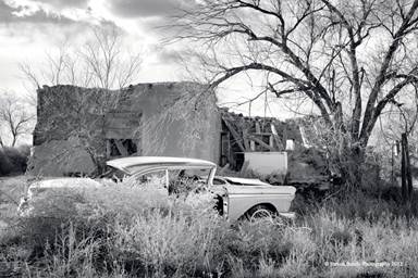 This is a photo tour image from Galisteo, New Mexico, taken in early December. Galisteo is southeast of Santa Fe along State Highway 41. If driving from Santa Fe, drive north on Interstate 25. Turn south onto US Highway 285 then continue south to State Highway 41. Once in the village of Galisteo, turn right at the big church. Stay to the left of the church and mail box stands, and then head up the hill. The old car & ruin will be on your right. Even though I have never had any issues around this property, still keep in mind it is someone’s private property, and you shouldn’t take liberties with the area.