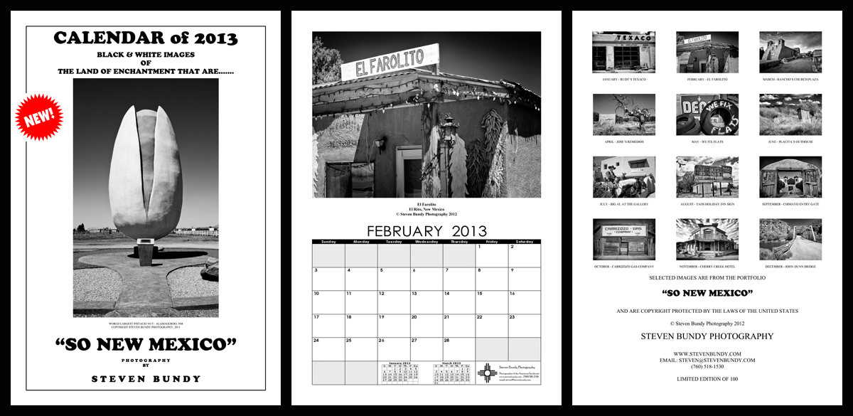 Steven Bundy Photography is offering a limited printing 2013 Calendar featuring Black & White images from his “So New Mexico” series. A total